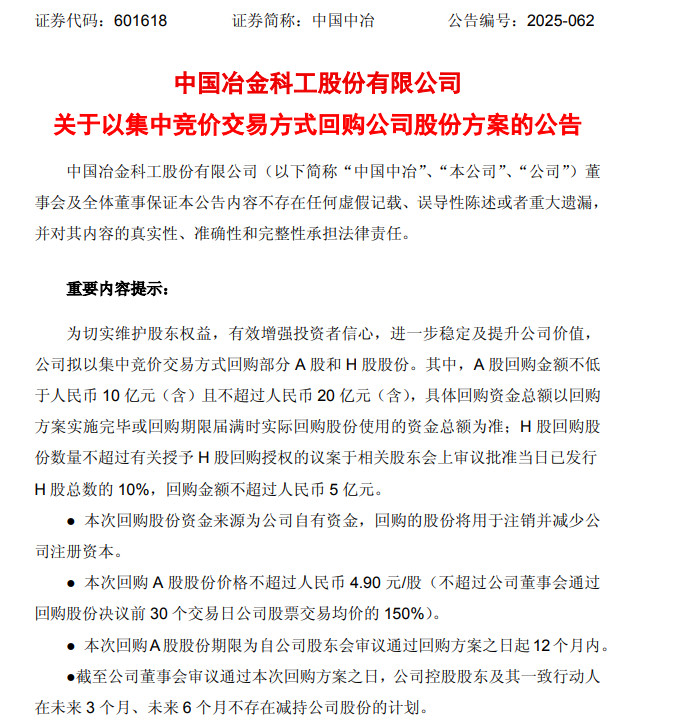 面对股价剧烈波动和市场质疑,中国中冶迅速做出回应。公司此次提出的回购计划规模可观,A股回购金额在10亿元至20亿元之间,H股回购金额不超过5亿元,总规模最高可达25亿元。