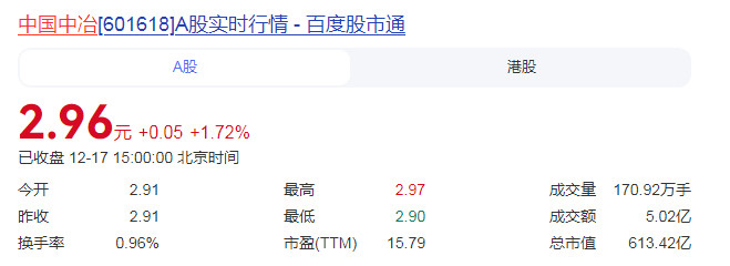 截至12月17日,中国中冶报2.96元/股,上涨1.72%,总市值超600亿元。