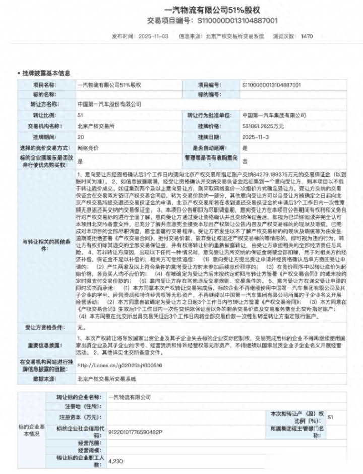 2025年11月,北京产权交易所发布信息,中国一汽集团公开挂牌转让其持有的一汽物流有限公司51%股权,转让底价为56.186亿元人民币。