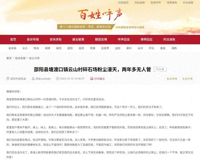 网友表示,位于塘渡口镇云山村旁的临时碎石场已开工两年多,长期缺乏有效降尘措施,导致村中“窗户不敢开,桌上天天一层灰,呼吸都呛鼻子,老人小孩咳嗽不断”。网友认为,“国家修路是好事,我们支持。可这个场子一开工,我们的苦日子就来了……”。该村民虽多次向县里、环保部门反映,但效果不明显。今年经媒体监督后曾有所好转,可不久便“旧病复发”,扬尘污染卷土重来,村民深感无奈与无助。